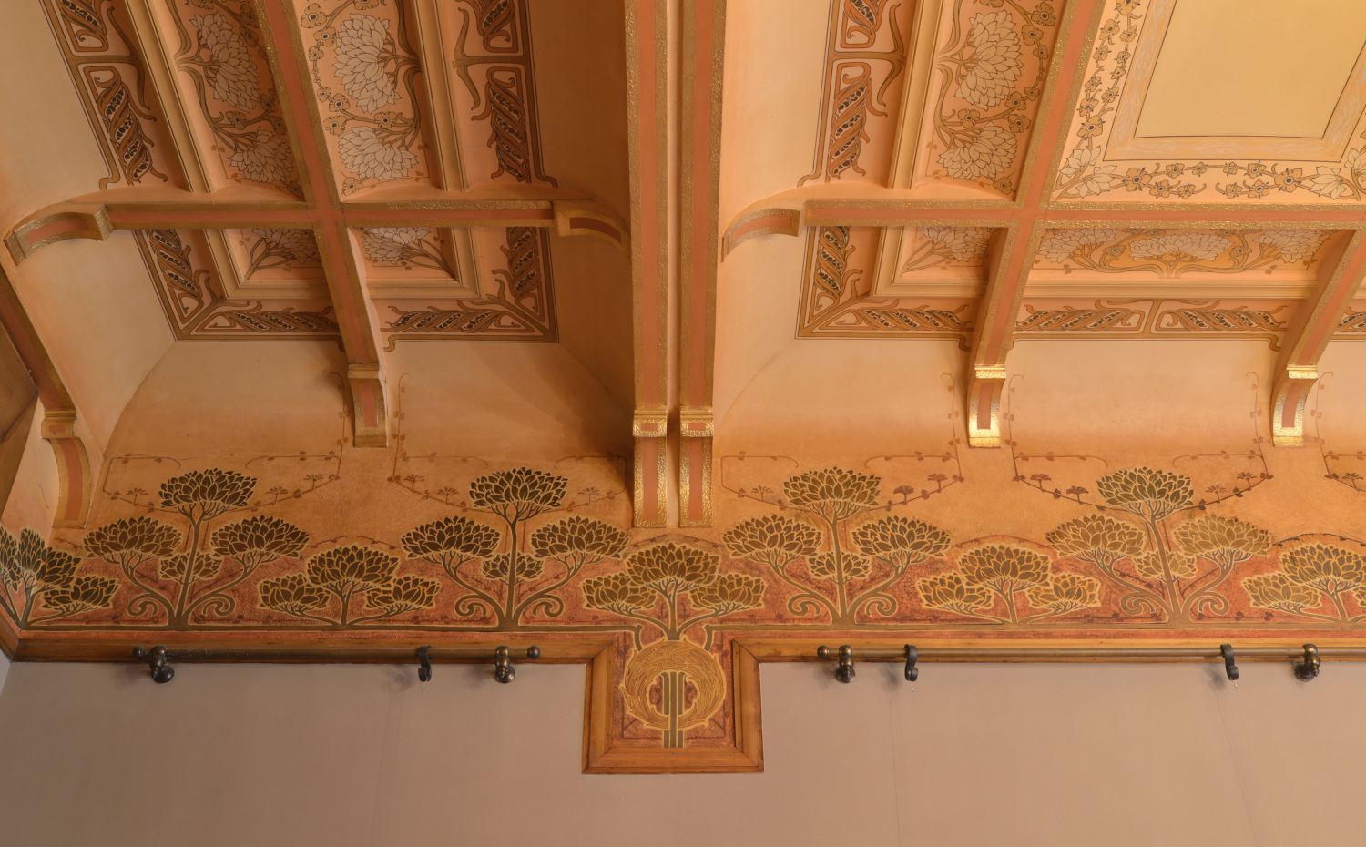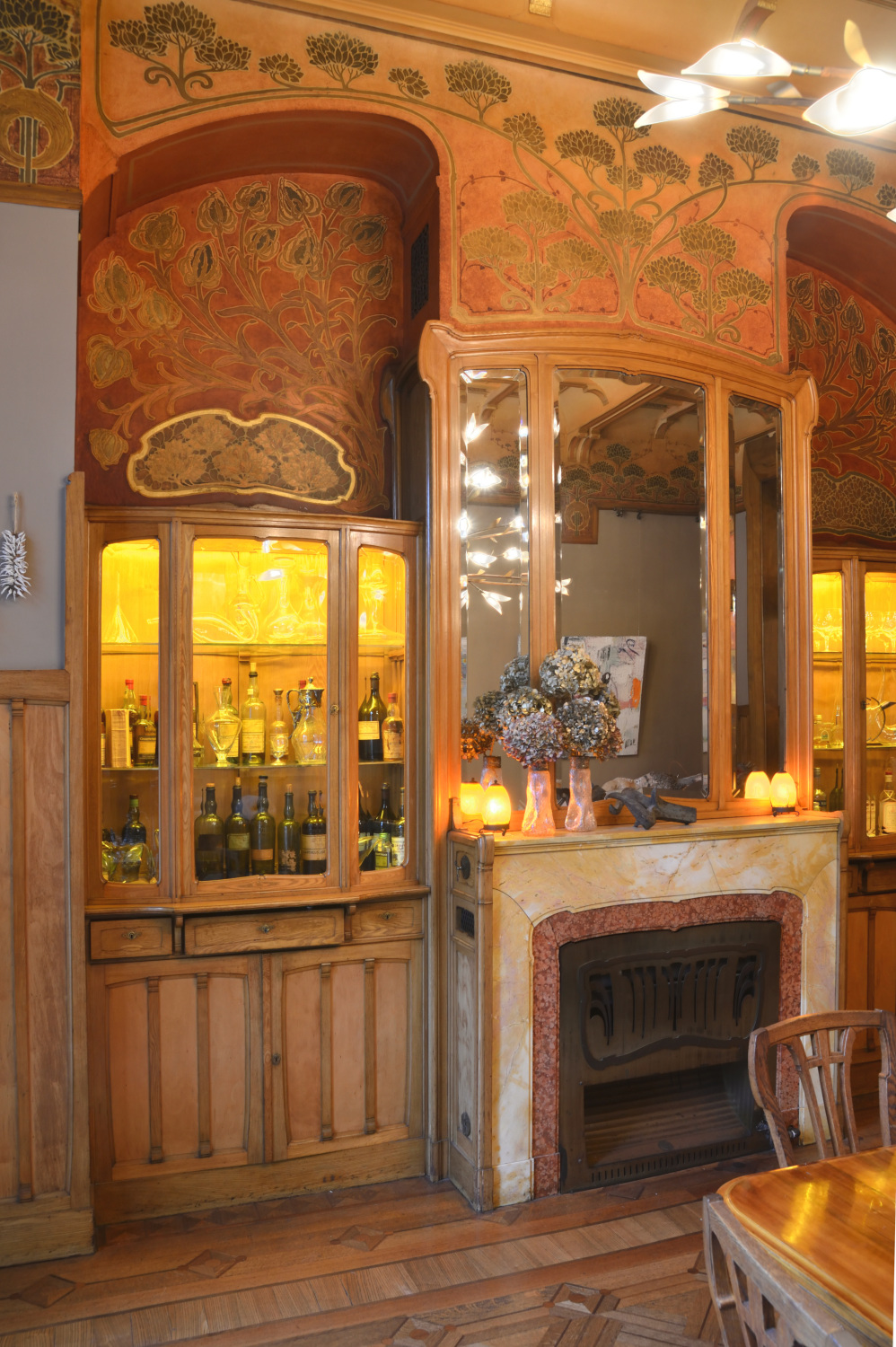 Dans le salon et la salle à manger du r.d.ch., plafond à voussettes peintes, cimaisesCorniche. Élément de couronnement d’un entablement, d’une élévation ou d’un élément d’élévation comme une baie ou une lucarne. La corniche se compose de moulures en surplomb les unes par rapport aux autres. La cimaise est la moulure supérieure de la corniche, située au-dessus du larmier.. Dans le salon, murs tendus d'une tapisserie à damas fleuri de couleur rose orangé, reconstituée d'après l'originale lors de la campagne de restauration de 2001. Dans la salle à manger, murs anciennement recouverts d'un papier japonais à motif végétal masquant un papier gaufré à motif de pivoine et imitant la soie. Ce papier japonais est aujourd'hui enlevé et un projet de restauration est établi pour remettre à neuf le papier gaufré sous-jacent. Attenant à la salle à manger, sous le 1er palierPalier ou repos d'escalier. Plate-forme qui sépare deux volées d'escalier. se trouve l'office, actuellement transformé en cuisine. La salle à manger et l'office sont tous deux reliés au jardin par quelques marches en fonteFer riche en carbone, moulé pour réaliser des éléments architecturaux comme des garde-corps, des colonnettes, des cache-boulins. Contrairement au fer forgé, la fonte est cassante et résiste mal à la flexion.. Côté salle à manger, une petite plate-forme en pavé de verre et structure métallique fait la transition avec les marches, permettant un apport de lumière dans les caves, autrefois à usage de cuisine. Parquet marqueté géométrique, d'un dessin original, en chêne et acajou dans le bureau, en chêne, acajou et frêne dans la salle à manger.