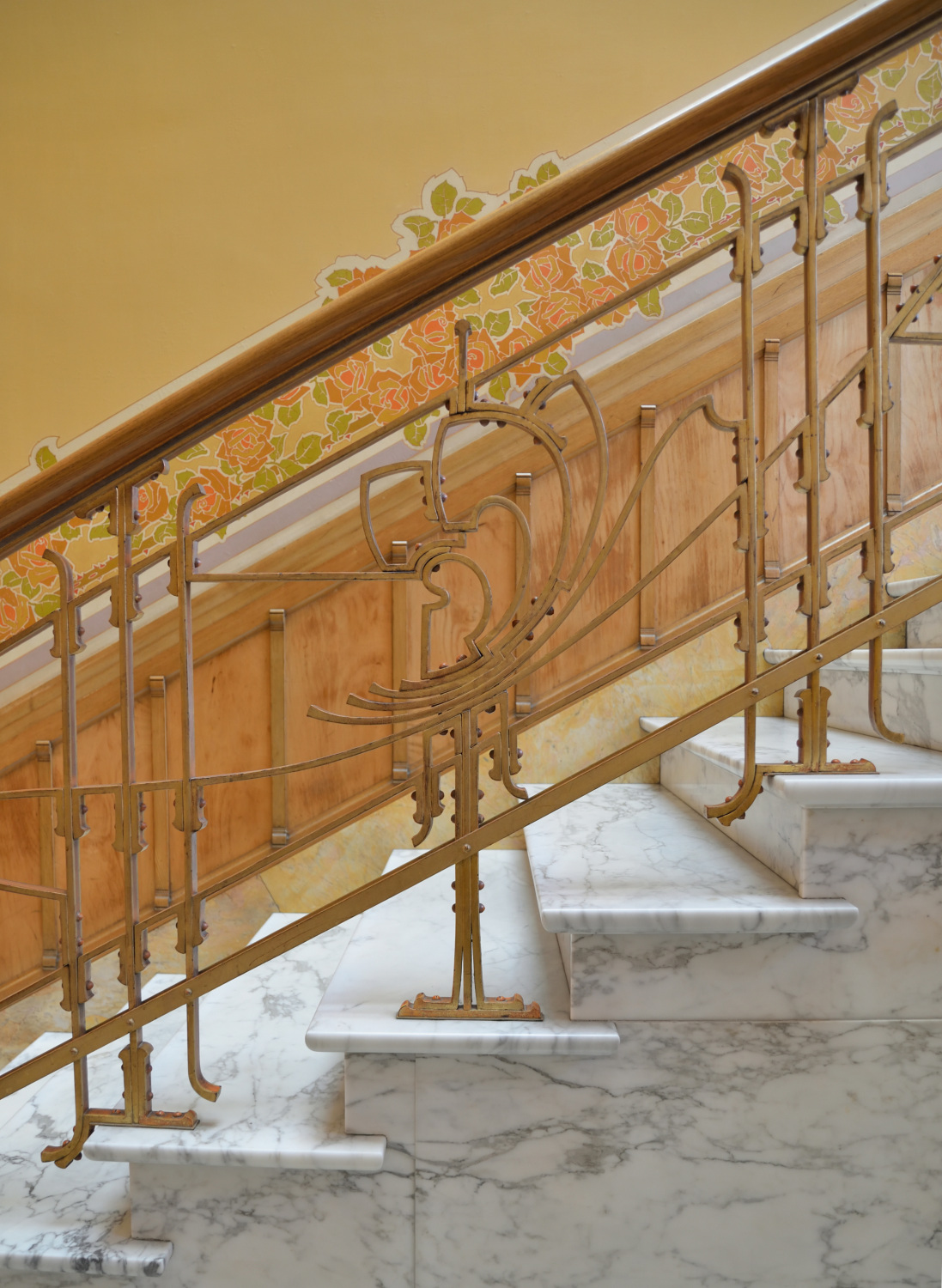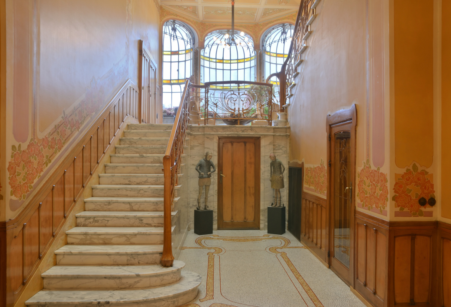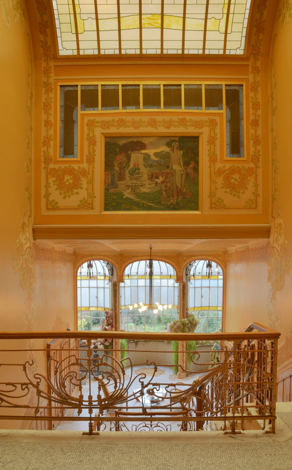L'escalier d'honneur constitue véritablement le cœur de l'habitation. Déployé sur deux imposantes volées en marbre blanc veiné, il est doublement éclairé par la lumière pénétrant depuis le 1er palierPalier ou repos d'escalier. Plate-forme qui sépare deux volées d'escalier. en vérandaJardin d’hiver ou véranda. Largement vitré, adossé à la façade arrière d’un bâtiment, le jardin d’hiver constitue une pièce d’agrément où l’on profite l’hiver des rayons du soleil dans une atmosphère de plantes vertes. Contrairement à la serre dont il dérive, le jardin d’hiver est une pièce de vie. et zénithalement par un vaste lanterneau en arcStructure appareillée de couvrement, cintrée selon un profil donné. de cercle, à verre coloré. VérandaJardin d’hiver ou véranda. Largement vitré, adossé à la façade arrière d’un bâtiment, le jardin d’hiver constitue une pièce d’agrément où l’on profite l’hiver des rayons du soleil dans une atmosphère de plantes vertes. Contrairement à la serre dont il dérive, le jardin d’hiver est une pièce de vie. constituant l'une des particularités de cet hôtel : sous la forme d'une grande verrière en fer et verre coloré et neutre, elle est traitée en trois absidioles sur plan cintré. Sur toute sa hauteur, sur les murs et le plafond, l'escalier est décoré d'une large friseBande horizontale, décorée ou non, située au milieu de l’entablement. Par extension, suite d’ornements en bande horizontale. peinte figurant des rosiers entremêlés, attribuable à Privat Livemont (selon Clerbois) ; la plus grande partie de la friseBande horizontale, décorée ou non, située au milieu de l’entablement. Par extension, suite d’ornements en bande horizontale. est aujourd'hui rafraîchie. Rampe en fers plats rivetés. 2e palierPalier ou repos d'escalier. Plate-forme qui sépare deux volées d'escalier. décoré à gauche d'un vitrail figurant des roses stylisées. De manière scénographique, une loggiaPetite pièce dans-œuvre, largement ouverte sur l’extérieur par une ou plusieurs larges baies non closes par des menuiseries. en tripletGroupement de trois baies. Les deux latérales, identiques, sont différentes de la baie centrale, d’ordinaire plus vaste., au dernier niveau, auquel on accède par l'escalier de service, ouvre sur l'escalier principal en contrebas. Côté jardin, le mur de l'escalier insère une fresque allégorique, probablement du peintre Georges Marie Baltus (selon Clerbois), partiellement encadrée d'une baieOuverture, d'ordinaire une porte ou une fenêtre, ménagée dans un pan de mur, ainsi que son encadrement. en U renversé garnie de vitraux. Cette baieOuverture, d'ordinaire une porte ou une fenêtre, ménagée dans un pan de mur, ainsi que son encadrement. assure une liaison entre la cage d'escalierEspace à l'intérieur duquel se développe un escalier. et la chambre qui se trouve derrière elle au 1er étage. Le hall d'entrée et les deux grands paliersPalier ou repos d'escalier. Plate-forme qui sépare deux volées d'escalier. ont reçu un sol en mosaïque figurant des roses stylisées.