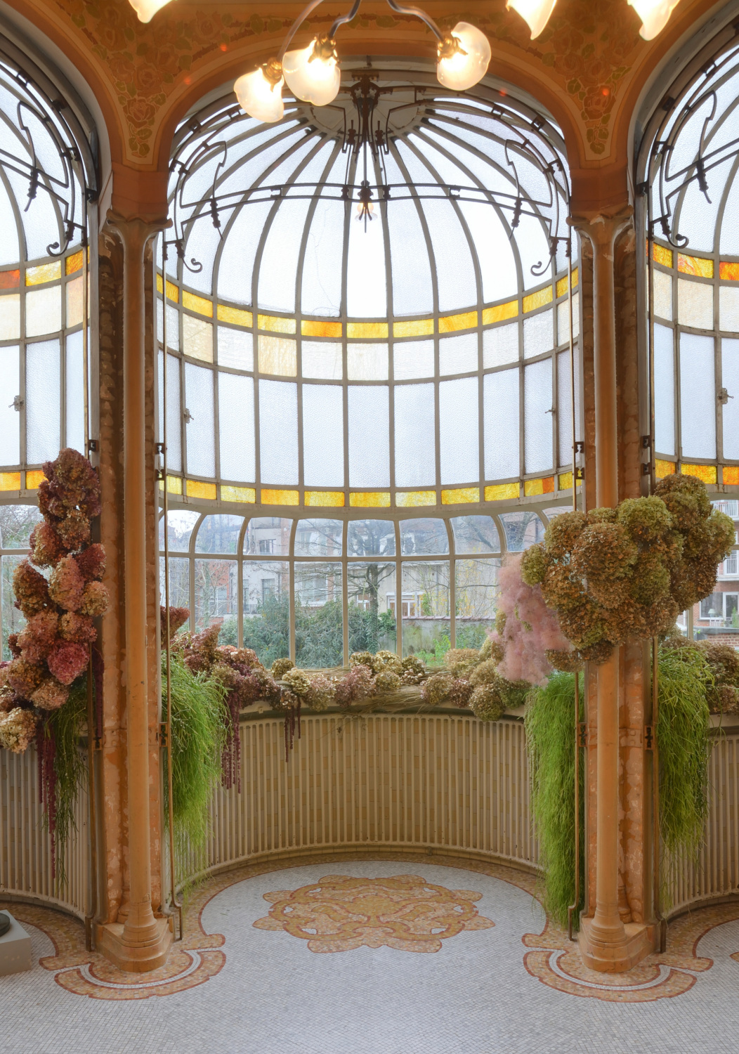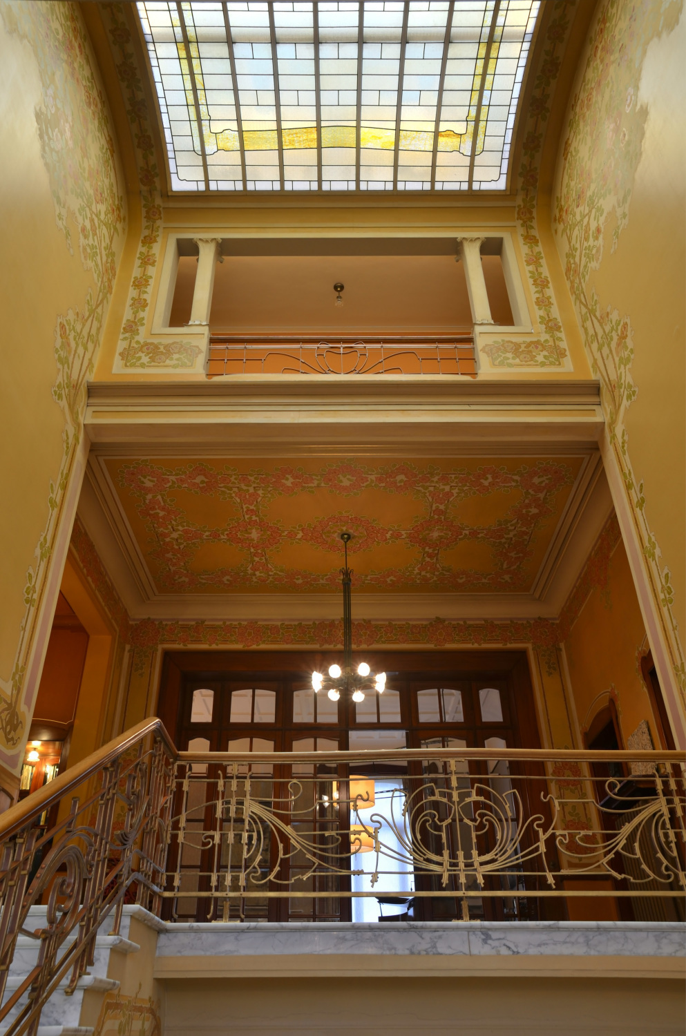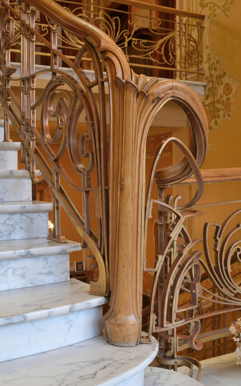 L'escalier d'honneur constitue véritablement le cœur de l'habitation. Déployé sur deux imposantes volées en marbre blanc veiné, il est doublement éclairé par la lumière pénétrant depuis le 1er palierPalier ou repos d'escalier. Plate-forme qui sépare deux volées d'escalier. en vérandaJardin d’hiver ou véranda. Largement vitré, adossé à la façade arrière d’un bâtiment, le jardin d’hiver constitue une pièce d’agrément où l’on profite l’hiver des rayons du soleil dans une atmosphère de plantes vertes. Contrairement à la serre dont il dérive, le jardin d’hiver est une pièce de vie. et zénithalement par un vaste lanterneau en arcStructure appareillée de couvrement, cintrée selon un profil donné. de cercle, à verre coloré. VérandaJardin d’hiver ou véranda. Largement vitré, adossé à la façade arrière d’un bâtiment, le jardin d’hiver constitue une pièce d’agrément où l’on profite l’hiver des rayons du soleil dans une atmosphère de plantes vertes. Contrairement à la serre dont il dérive, le jardin d’hiver est une pièce de vie. constituant l'une des particularités de cet hôtel : sous la forme d'une grande verrière en fer et verre coloré et neutre, elle est traitée en trois absidioles sur plan cintré. Sur toute sa hauteur, sur les murs et le plafond, l'escalier est décoré d'une large friseBande horizontale, décorée ou non, située au milieu de l’entablement. Par extension, suite d’ornements en bande horizontale. peinte figurant des rosiers entremêlés, attribuable à Privat Livemont (selon Clerbois) ; la plus grande partie de la friseBande horizontale, décorée ou non, située au milieu de l’entablement. Par extension, suite d’ornements en bande horizontale. est aujourd'hui rafraîchie. Rampe en fers plats rivetés. 2e palierPalier ou repos d'escalier. Plate-forme qui sépare deux volées d'escalier. décoré à gauche d'un vitrail figurant des roses stylisées. De manière scénographique, une loggiaPetite pièce dans-œuvre, largement ouverte sur l’extérieur par une ou plusieurs larges baies non closes par des menuiseries. en tripletGroupement de trois baies. Les deux latérales, identiques, sont différentes de la baie centrale, d’ordinaire plus vaste., au dernier niveau, auquel on accède par l'escalier de service, ouvre sur l'escalier principal en contrebas. Côté jardin, le mur de l'escalier insère une fresque allégorique, probablement du peintre Georges Marie Baltus (selon Clerbois), partiellement encadrée d'une baieOuverture, d'ordinaire une porte ou une fenêtre, ménagée dans un pan de mur, ainsi que son encadrement. en U renversé garnie de vitraux. Cette baieOuverture, d'ordinaire une porte ou une fenêtre, ménagée dans un pan de mur, ainsi que son encadrement. assure une liaison entre la cage d'escalierEspace à l'intérieur duquel se développe un escalier. et la chambre qui se trouve derrière elle au 1er étage. Le hall d'entrée et les deux grands paliersPalier ou repos d'escalier. Plate-forme qui sépare deux volées d'escalier. ont reçu un sol en mosaïque figurant des roses stylisées.