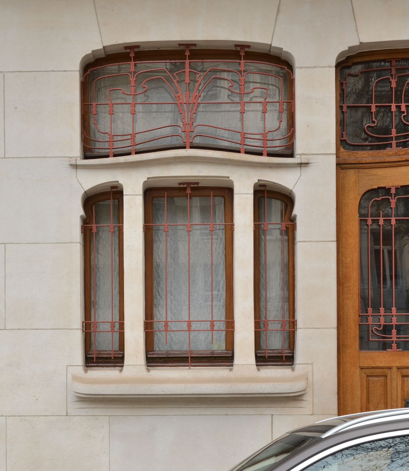 Traitement de la pierre soigné et inventif, fait de détails audacieux et de discrets éléments de décor : appuisAppui de fenêtre. Élément d’ordinaire en pierre, limitant une baie vers le bas. du r.d.ch. au profil souple, sommiersLes sommiers sont les deux premiers claveaux d’un arc, portant directement sur les piédroits. formant un léger ressautSaillie d'une partie de mur par rapport à l’alignement général., jeux de ciselures soulignant certains éléments…