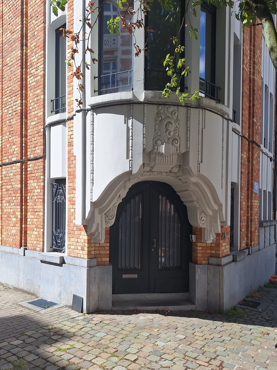 À l'angle de la r. des Taxandres, maison construite en style Art DécoStyle Art Déco (entre-deux-guerres). Tendance à la géométrisation des formes et des ornements architecturaux, doublée de jeux de matériaux, de textures et de couleurs. par l'arch. Léon STYNEN, d'Anvers, suivant demande de permis de 1924.