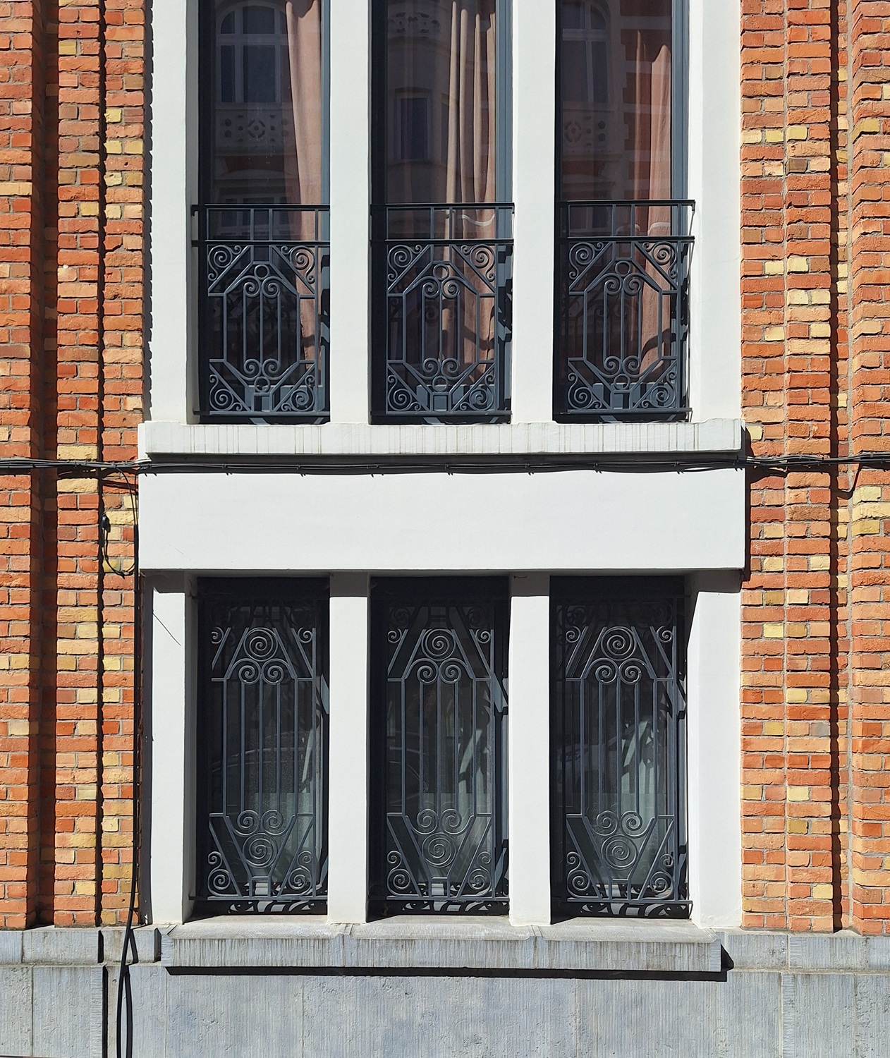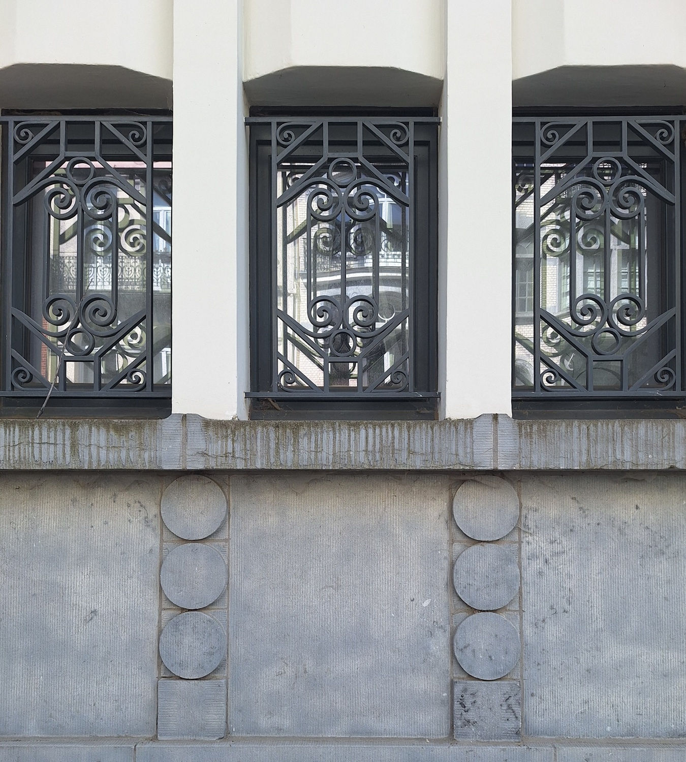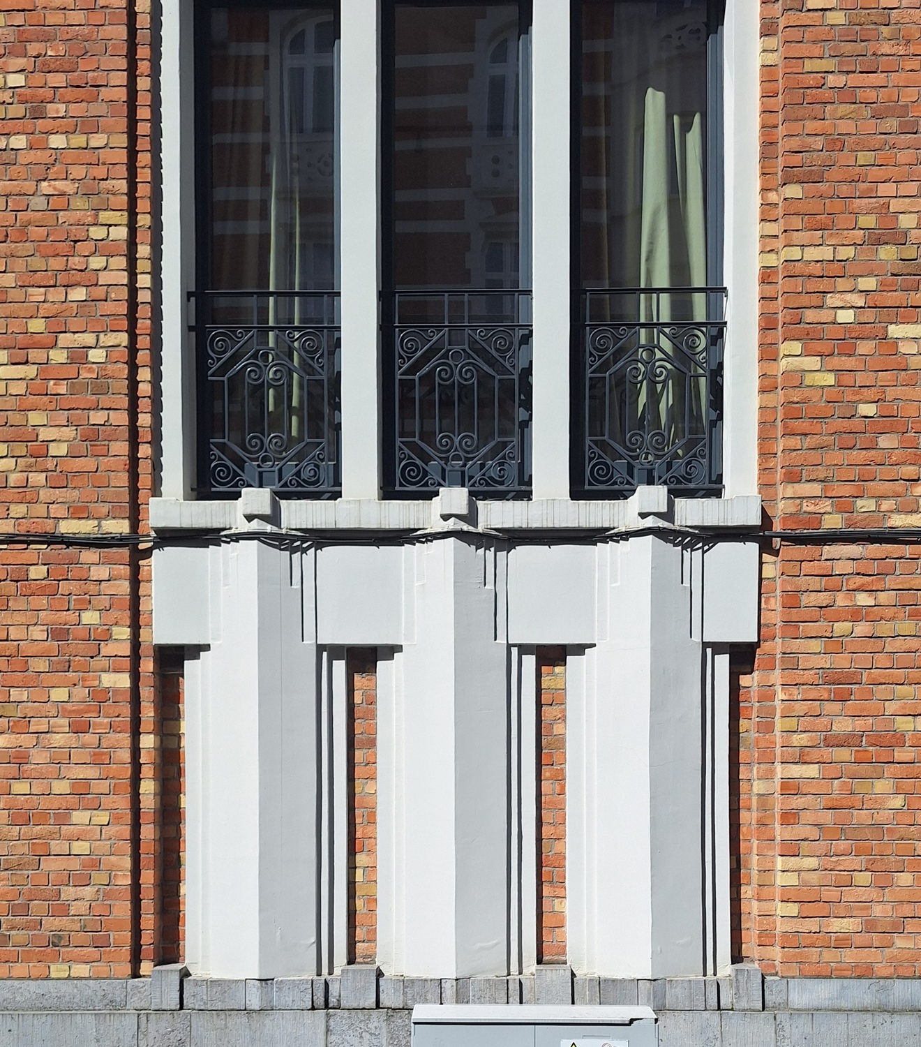 Façade en briques et béton développant six travées1. Division verticale d’une élévation, composée d’une superposition d’ouvertures, réelles ou feintes. 2. En plan, la travée est l'espace compris entre deux rangées de supports disposées perpendiculairement à la façade. séparées par des pilastresÉlément vertical plat en ressaut qui évoque un support (un pilier engagé). Il peut être muni d’une base et d’un chapiteau., sur trois niveaux de baiesOuverture, d'ordinaire une porte ou une fenêtre, ménagée dans un pan de mur, ainsi que son encadrement. rect. trigéminées. Travée1. Division verticale d’une élévation, composée d’une superposition d’ouvertures, réelles ou feintes. 2. En plan, la travée est l'espace compris entre deux rangées de supports disposées perpendiculairement à la façade. du pan coupéPan de mur situé de biais sur l’angle d’un bâtiment. encadrée par deux étroites travées1. Division verticale d’une élévation, composée d’une superposition d’ouvertures, réelles ou feintes. 2. En plan, la travée est l'espace compris entre deux rangées de supports disposées perpendiculairement à la façade. terminées par une lucarneOuvrage construit sur un toit et permettant d’éclairer le comble par une ou plusieurs fenêtres. à gradins ajourée d'un tripletGroupement de trois baies. Les deux latérales, identiques, sont différentes de la baie centrale, d’ordinaire plus vaste.. Surmonté d'un balcon au garde-corpsOuvrage de clôture qui ferme un balcon, une terrasse, une porte-fenêtre, une gaine d'ascenseur... en maçonnerie et en ferronnerieÉléments en fer d’une construction, qu’ils soient en fer forgé, en fonte ou dans un autre matériau ferreux., bow-windowDe l’anglais bow (arc dans le sens d’arqué, courbé) et window (fenêtre). Le bow-window apparaît avec l’Art nouveau. Il s’agit d’un élément en surplomb qui s’intègre par son plan cintré à la façade. Il se différencie de la logette, d’ordinaire de plan rectangulaire et qui paraît appliquée sur la façade. Le bow-window peut occuper plusieurs niveaux. à retombées successives en drapé formant auventPetit toit couvrant un espace devant une porte ou une vitrine. sculpté au-dessus de l'entrée. Fenêtres du r.d.ch. munies de grilles Art DécoStyle Art Déco (entre-deux-guerres). Tendance à la géométrisation des formes et des ornements architecturaux, doublée de jeux de matériaux, de textures et de couleurs. caractéristiques. Garde-corpsOuvrage de clôture qui ferme un balcon, une terrasse, une porte-fenêtre, une gaine d'ascenseur... de même type à l'étage. 1re travée1. Division verticale d’une élévation, composée d’une superposition d’ouvertures, réelles ou feintes. 2. En plan, la travée est l'espace compris entre deux rangées de supports disposées perpendiculairement à la façade. sous couverture en terrasse, toiture mansardéeUne toiture est dite mansardée lorsqu'elle présente deux pentes différentes sur le même versant. Le brisis est le pan inférieur de la toiture mansardée. Le pan supérieur se nomme le terrasson. ailleurs. Jardin latéral clôturé par un mur r. des Taxandres.