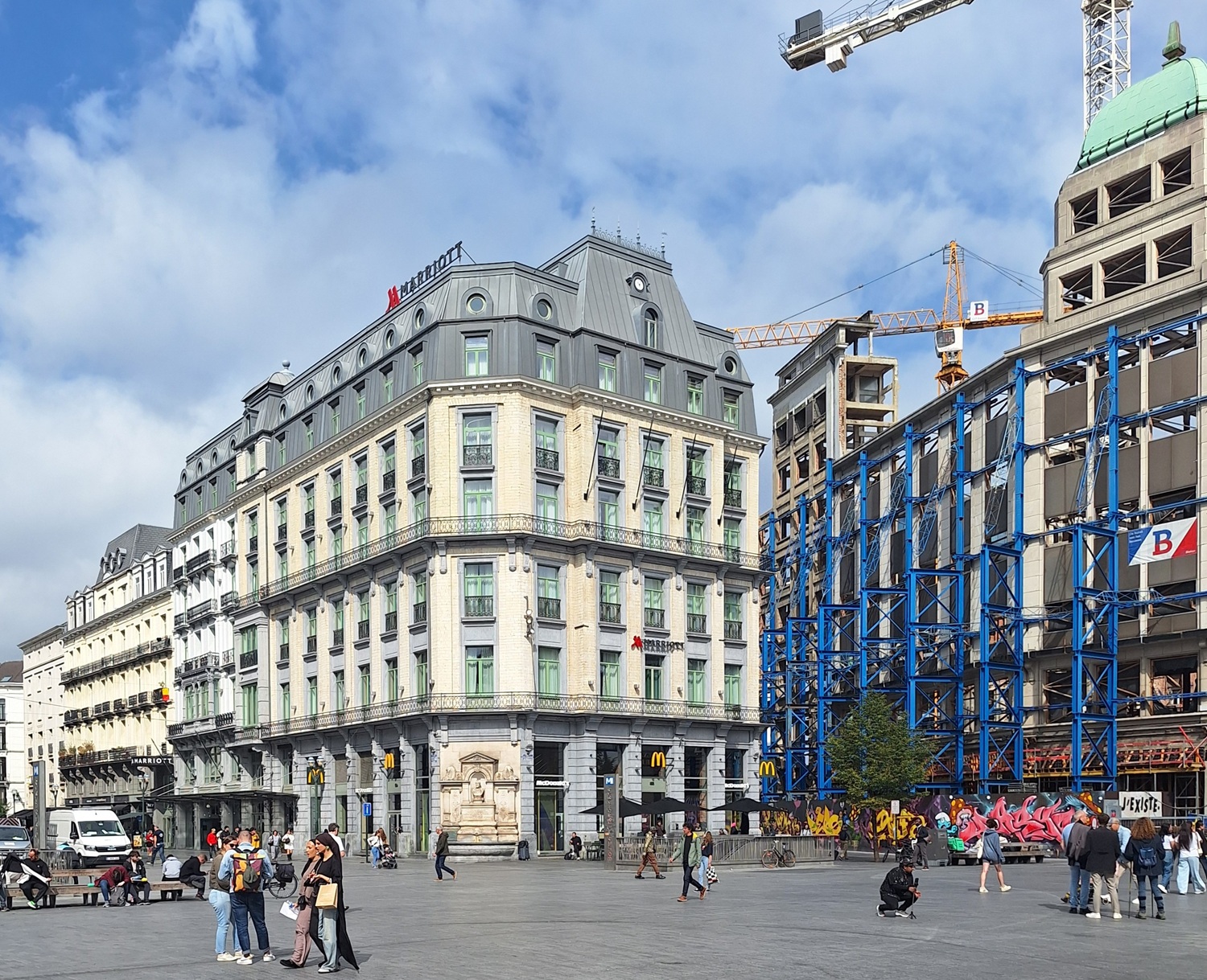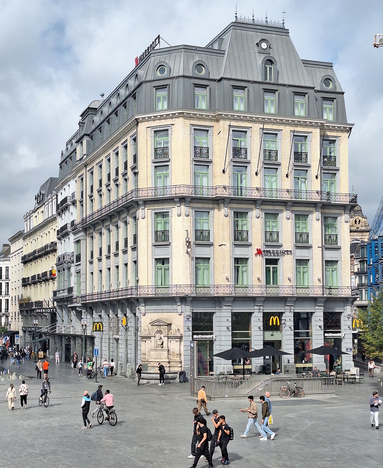 MonumentaalZuilen of pilasters die over de volle hoogte of over meer dan één verdieping opgaan, onafhankelijk van de door vensters en bouwlagen gegeven maten. hoekgebouw in eclectischeVeel voorkomende stijl (ca. 1850-1914) die inspiratie put uit verschillende architectuurstijlen uit het verleden. Komt door de combinatie van enerzijds verschillende stijlelementen en anderzijds nieuwe technieken en materialen tot een unieke eigentijdse creatie. stijl, samen met het tegenoverliggende, gelijkaardige nr. 2, de ingang van de Auguste Ortsstraat markerend. Omvat vijf bouwlagen, zes + één + vijf traveeënVerticale geleding van een gevel, bepaald door afstand tussen twee opeenvolgende steunpunten (vb. muurdammen, zuilen, ...) onder mansardedakGebroken kap of Frans dak met met steile ondervlakken en licht hellende bovenvlakken.. Lijstgevel van witte natuursteen op de sokkelvormende onderbouwHoge sokkel, reikend tot ongeveer het midden van de toegang; meestal in hardsteen. van hardsteen. Geleding van de hoofdgevel (Beursplein) door middel van een drie traveeënVerticale geleding van een gevel, bepaald door afstand tussen twee opeenvolgende steunpunten (vb. muurdammen, zuilen, ...) breed risalietRisaliet (Italiaans, van risalto: uitstekend deel), vooruitspringend volume van een gevel dat over de hele hoogte doorloopt en soms hoger is; naar gelang de positie worden er midden-, zij- en hoekrisalieten onderscheiden. verhoogd met een belvédère, idem in uiterst linkertravee (Auguste Ortsstraat). Bovenverdieping gegroepeerd in twee registersVensterstrook in een topgevel. aangegeven door verticaal oplopende vensternissen en oorspronkelijk belijnd met omlopende gevelbrede balkons aan tweede en vierde bouwlaag cf. afgezaagde consolesVoornamelijk voluut- of S-vormig kraagstuk, soms ook louter decoratief.. Rechthoekige bovenvensters in doorlopende riemomlijsting met orenUitstekend deel van sommige bouwelementen of -constructies, meestal louter decoratief. en geprofileerde dorpelOnderdorpel van een deur. ; gietijzerenHard, bros en niet smeedbaar ijzer; gegoten in herbruikbare mallen; meestal gebruikt voor de borstwering van balkons. borstweringen1. Verhoogd gedeelte van een vestingsmuur waarachter men veilig kan lopen; - 2. Muurtje of hekwerk (balkon, terras); - 3. Deel van een muur tussen vloer en onderzijde van een venster; - 4. Verhoging van de buitenmuren van een huis boven de zolderbalken waarop een muurplaat rust. bij derde en vijfde bouwlaag Gevelbeëindiging door middel van een gekorniste kroonlijstStelselmatig uitkragende geprofileerde lijst boven een muur of een ander belangrijk bouwdeel (entablement). op klossenKraagstuk van een kroonlijst met verfijnd uitgesneden en/of gefreesd hangend element of drop.. DakkapellenUit het dakvlak opgaand venster; meestal in hout en vaak onder spitse kap. met deels bewaard gebogen frontonDriehoekige of segmentvormige bekroning van een gevel of muuropening.. Begane grond van geblokte pilastersPlatte, weinig uitspringende muurpijler, vaak met basis en kapiteel., met entresol, slechts verbouwd in uiterste traveeënVerticale geleding van een gevel, bepaald door afstand tussen twee opeenvolgende steunpunten (vb. muurdammen, zuilen, ...) van zijgevels; brede rondboogdeur in de rechtertravee (Paul Devauxstraat). Hoofdgevel voorheen nog gemarkeerd door een breed terras op gietijzerenHard, bros en niet smeedbaar ijzer; gegoten in herbruikbare mallen; meestal gebruikt voor de borstwering van balkons. zuilenCilindervormig steunpunt; vaak voorzien van basis en kapiteel. De kleine en/of dunne variant ervan wordt colonnet genoemd..