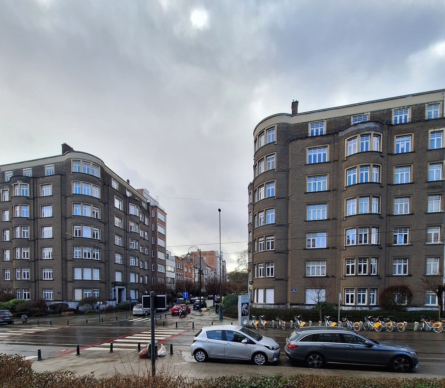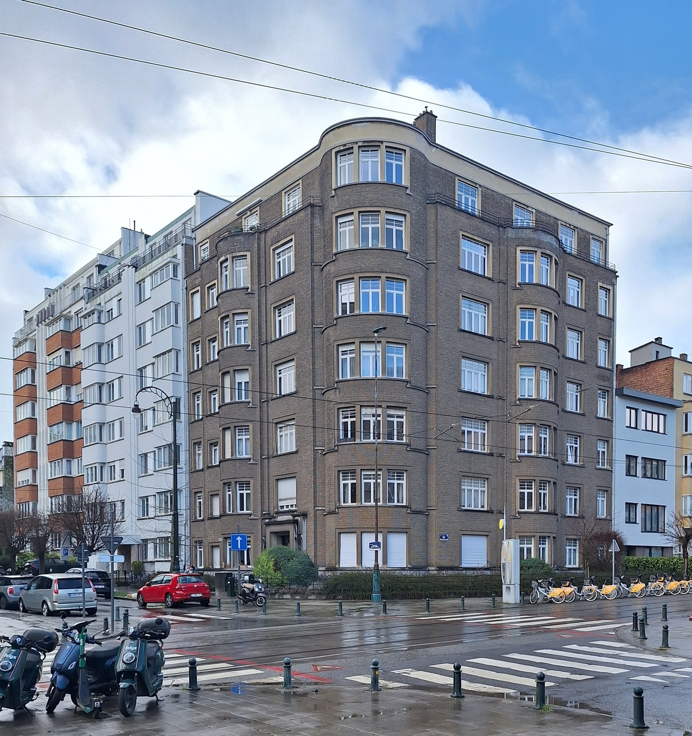 Op de hoek met de Waaglaan, geheel van twee verwante, tegenover elkaar liggende appartementsgebouwen in modernistischeInternationale stijl (vanaf ca. 1920) waarbij het functionele primeert op de vorm. Wordt gekenmerkt door een rationeel grondplan, eenvoudige geometrische vormen, platte daken en het gebruik van moderne materialen zoals gewapend beton. stijl, gebouwd i.o.v. de Société Civile de l'Avenue des Nations, 1934.