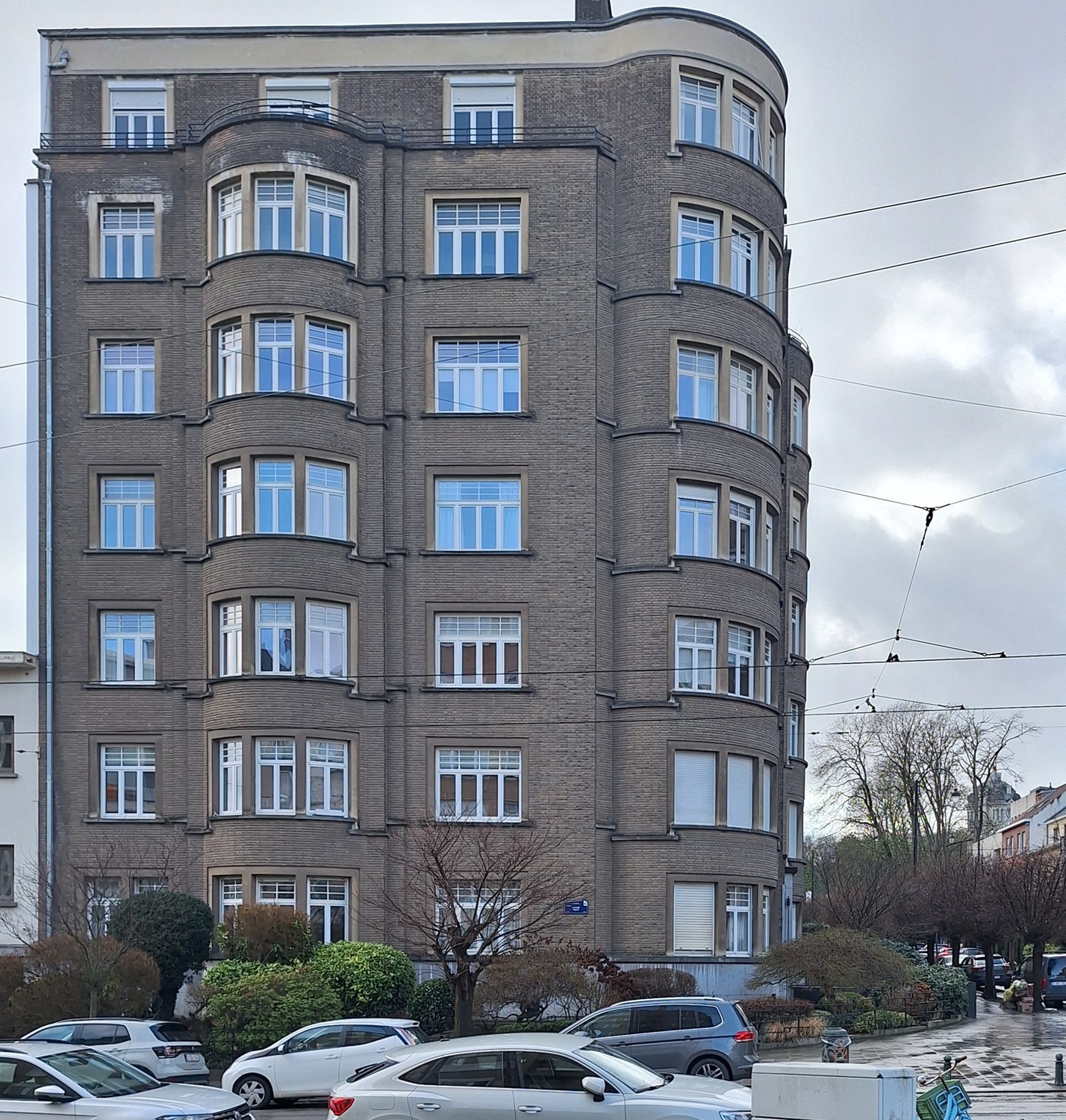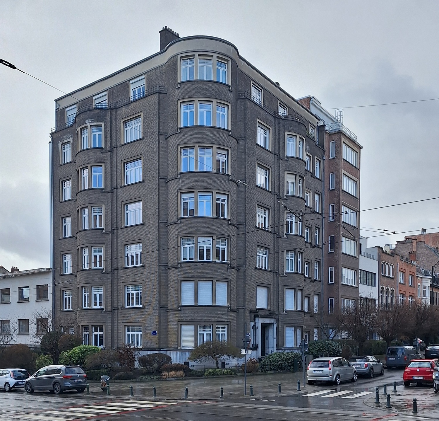 Opstanden van zeven bouwlagen en acht traveeënVerticale geleding van een gevel, bepaald door afstand tussen twee opeenvolgende steunpunten (vb. muurdammen, zuilen, ...), in bruine baksteen met hardstenen elementen. De gevels worden verlevendigd door uitsprongen en door drie gebogen gestapelde erkersRechthoekig of veelhoekig uitbouwsel, als het ware op de gevel geplakt en daardoor deel uitmakend van de achterliggende ruimte; vaak over één of meer verdiepingen gestapeld.: een op de hoek, de twee overige op de zijgevels, waar ze vanaf de begane grond vertrekken en tot de vijfde verdieping doorlopen. Op de zijgevels worden de laatste bouwlagen afgeboord door een terras afgesloten door een metalen vensterleuningLage, versierde leuning boven een onderdorpel, meestal in metaal.. SchrijnwerkVerzameling van al het (niet-constructief) houten materiaal zoals deuren, vensterkozijnen, erkeronderdelen, kroonlijst, …; bij uitbreiding ook materiaal in aluminium, PVC, ... deels bewaard.