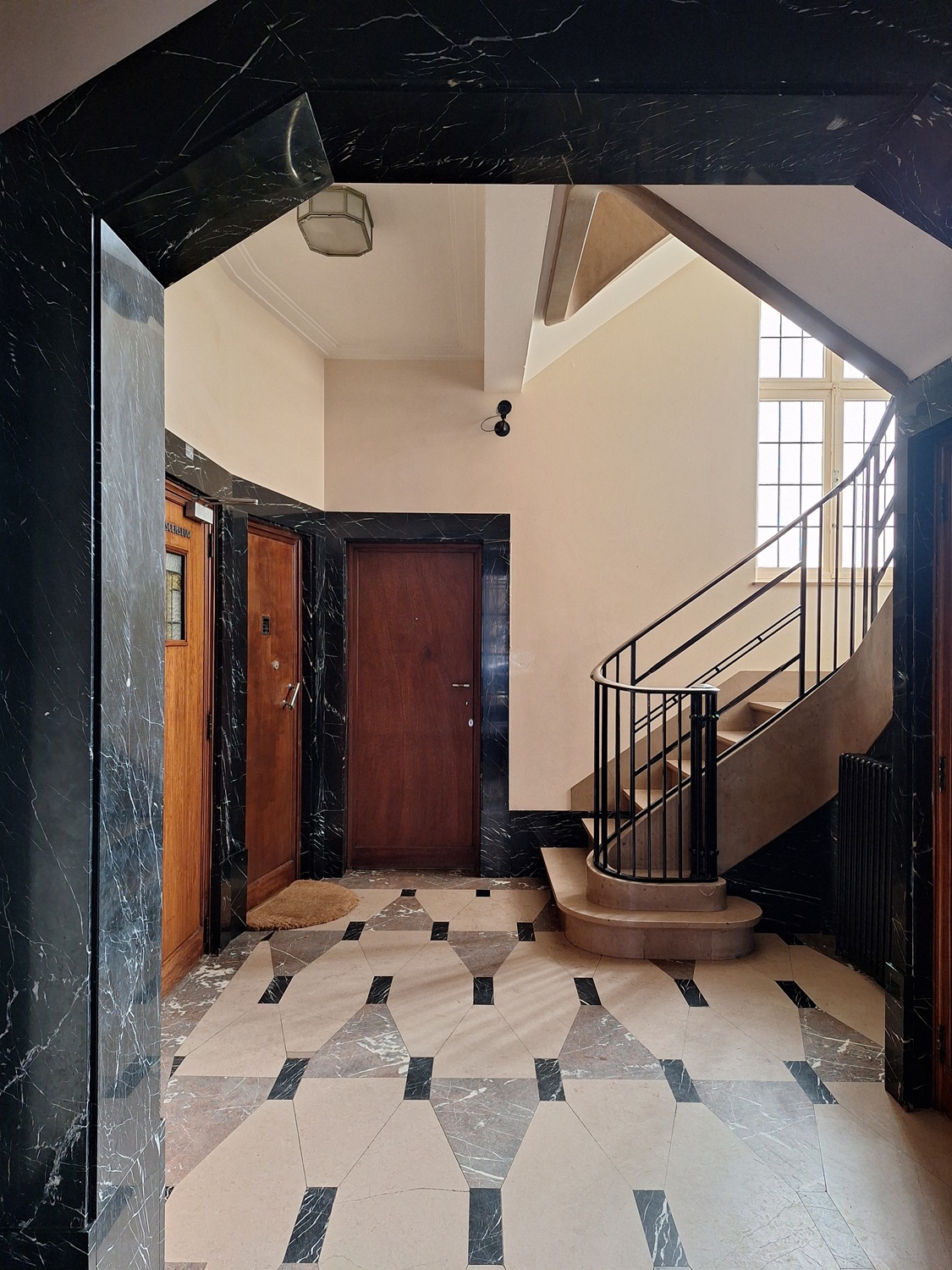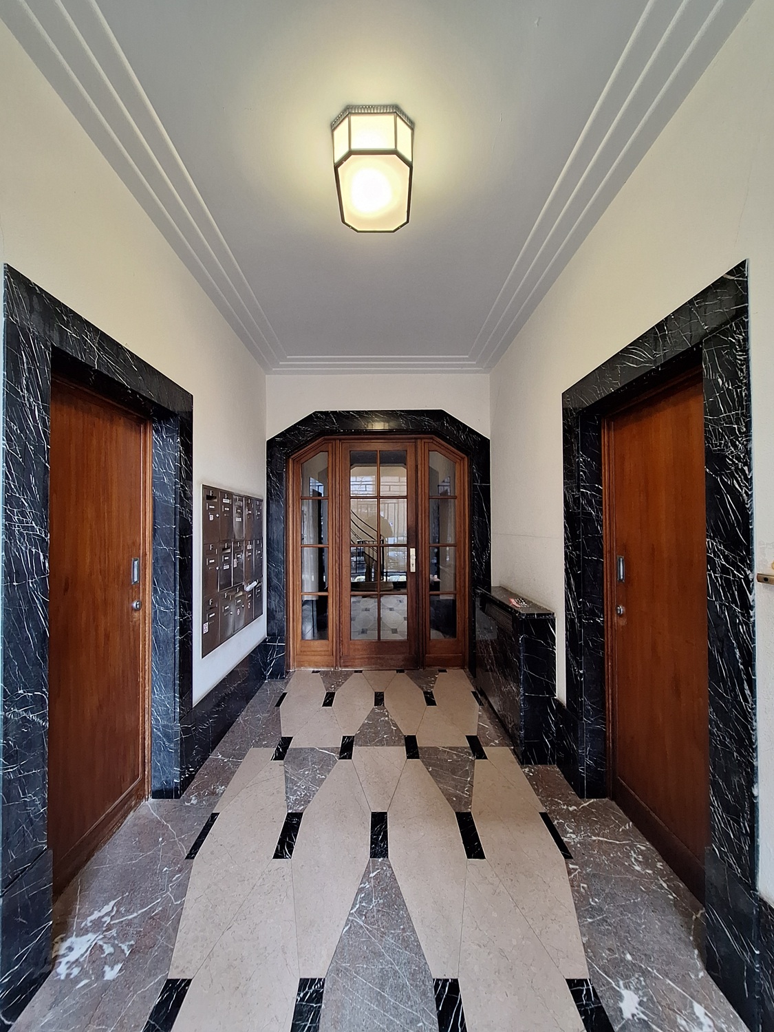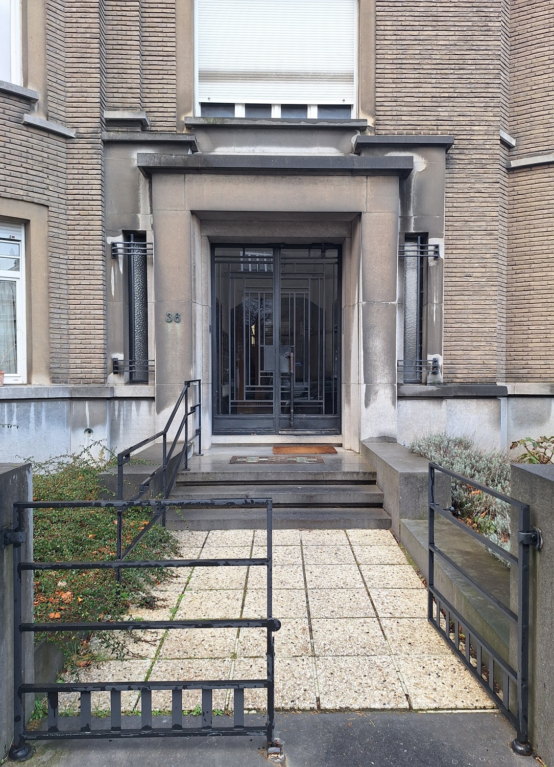 Verzorgde inkomhallen met marmeren vloeren, gelegd in ruitpatroon van zwart, beige en roze marmer. LambriseringenWandbetimmering, meestal bestaande uit paneelwerk, aangebracht tegen een binnenmuur (vaak het onderste gedeelte ervan); later ook in marmer, stucwerk, … en deuromlijstingen in zwart marmer. Trap vermoedelijk in travertijn met ijzeren trapleuning. Het trappenhuisGedeelte van een gebouw waarin de trappen zijn ondergebracht. wordt verlicht door één doorlopende vensterpartij. Bewaard schrijnwerkVerzameling van al het (niet-constructief) houten materiaal zoals deuren, vensterkozijnen, erkeronderdelen, kroonlijst, …; bij uitbreiding ook materiaal in aluminium, PVC, ... van de binnendeuren, met geïntegreerde liften, waaronder een bewaarde Shindlerlift in gesloten schachtDe ruimte waarin de liftkooi en/of het tegengewicht bewegen, begrensd door de wanden, het plafond en de bodem van de put. De schacht kan gesloten of gedeeltelijk open zijn. op nr. 36.