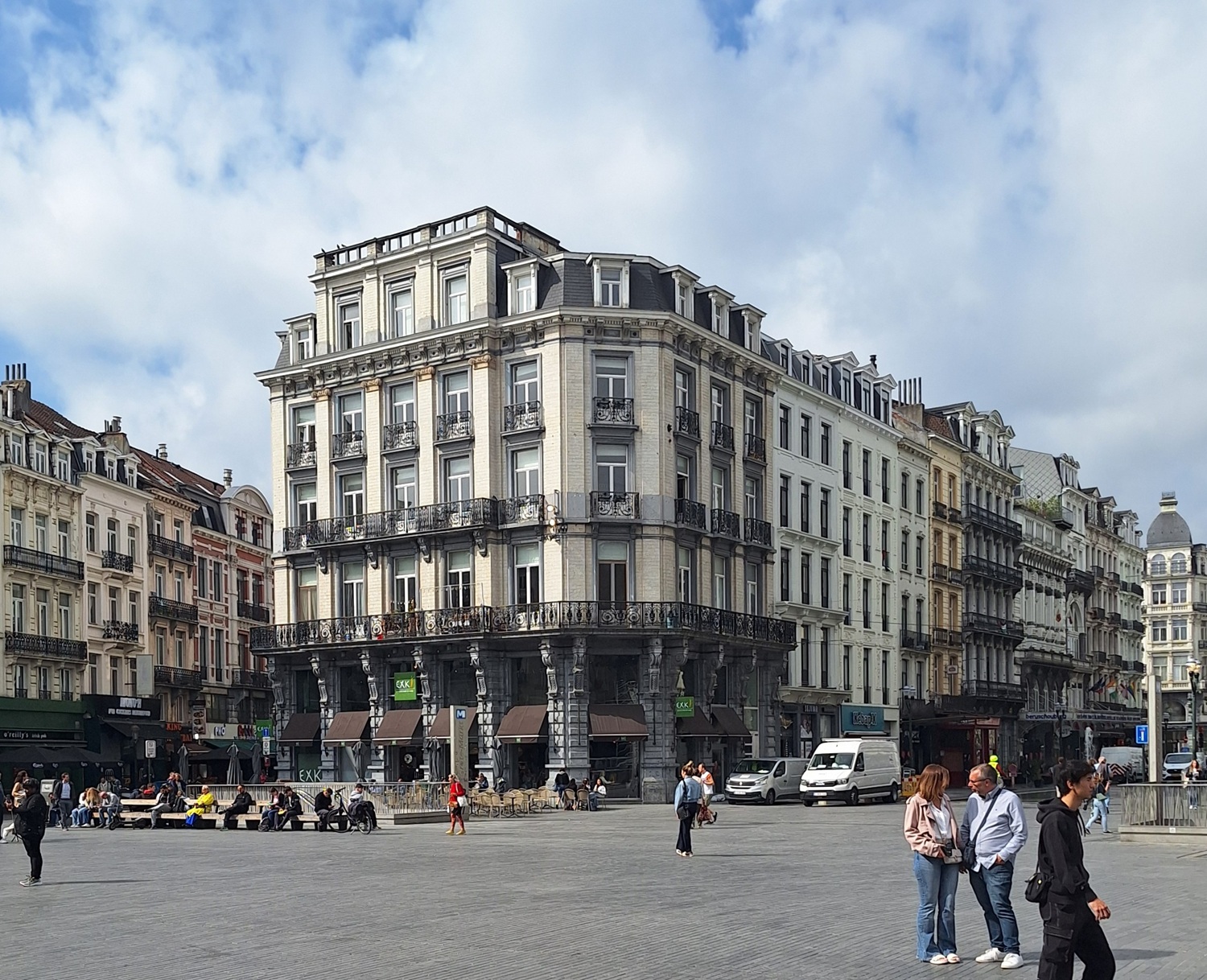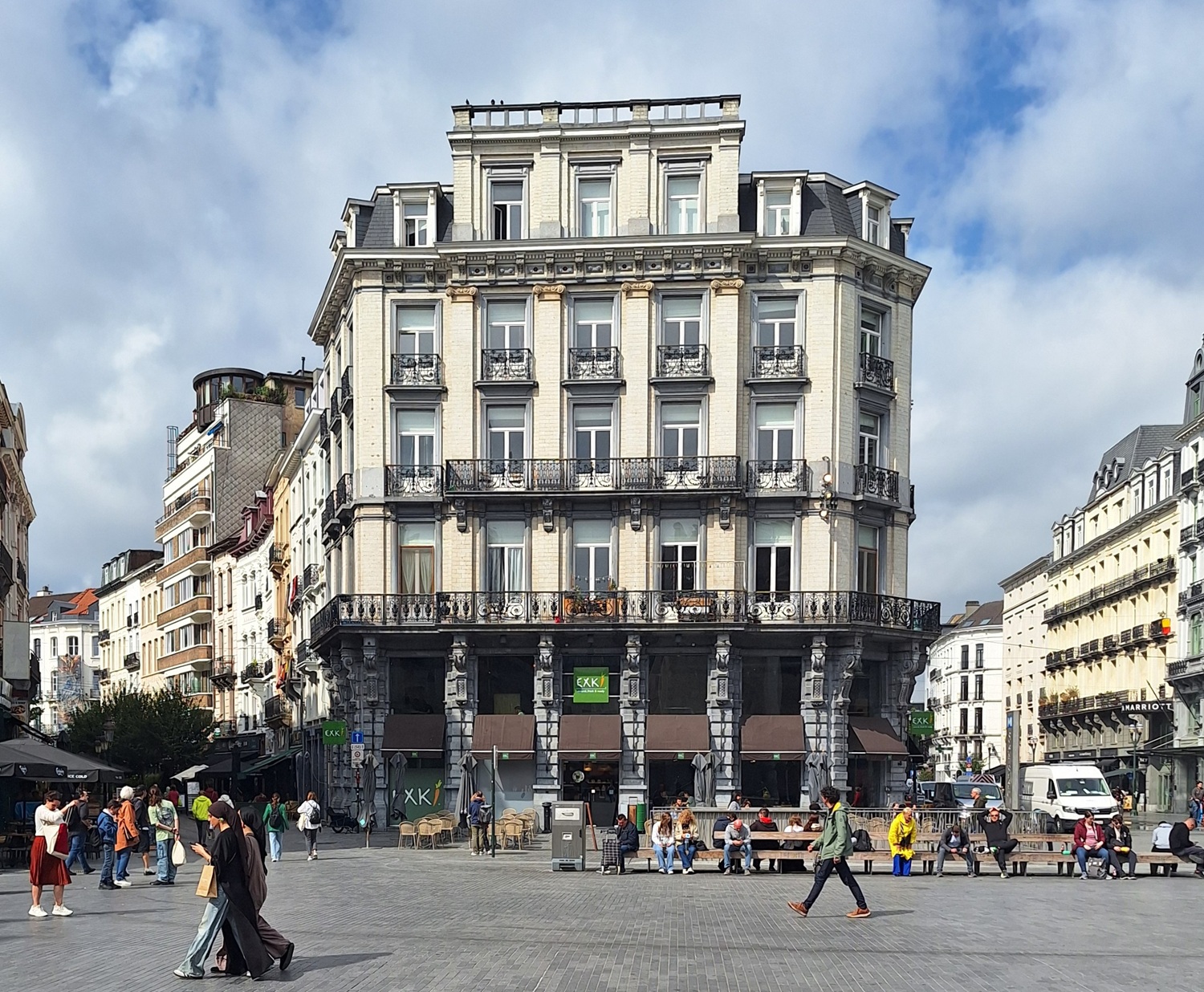 Oorspronkelijk Café des Templiers, later Café du Commerce Bourse. Samen met het tegenoverliggende, gelijkaardige nr. 3 Hôtel Central, de ingang van de Auguste Ortsstraat markerend; voorafgaandelijk project voor beide gebouwen door architect Ch. Gys van 1884.